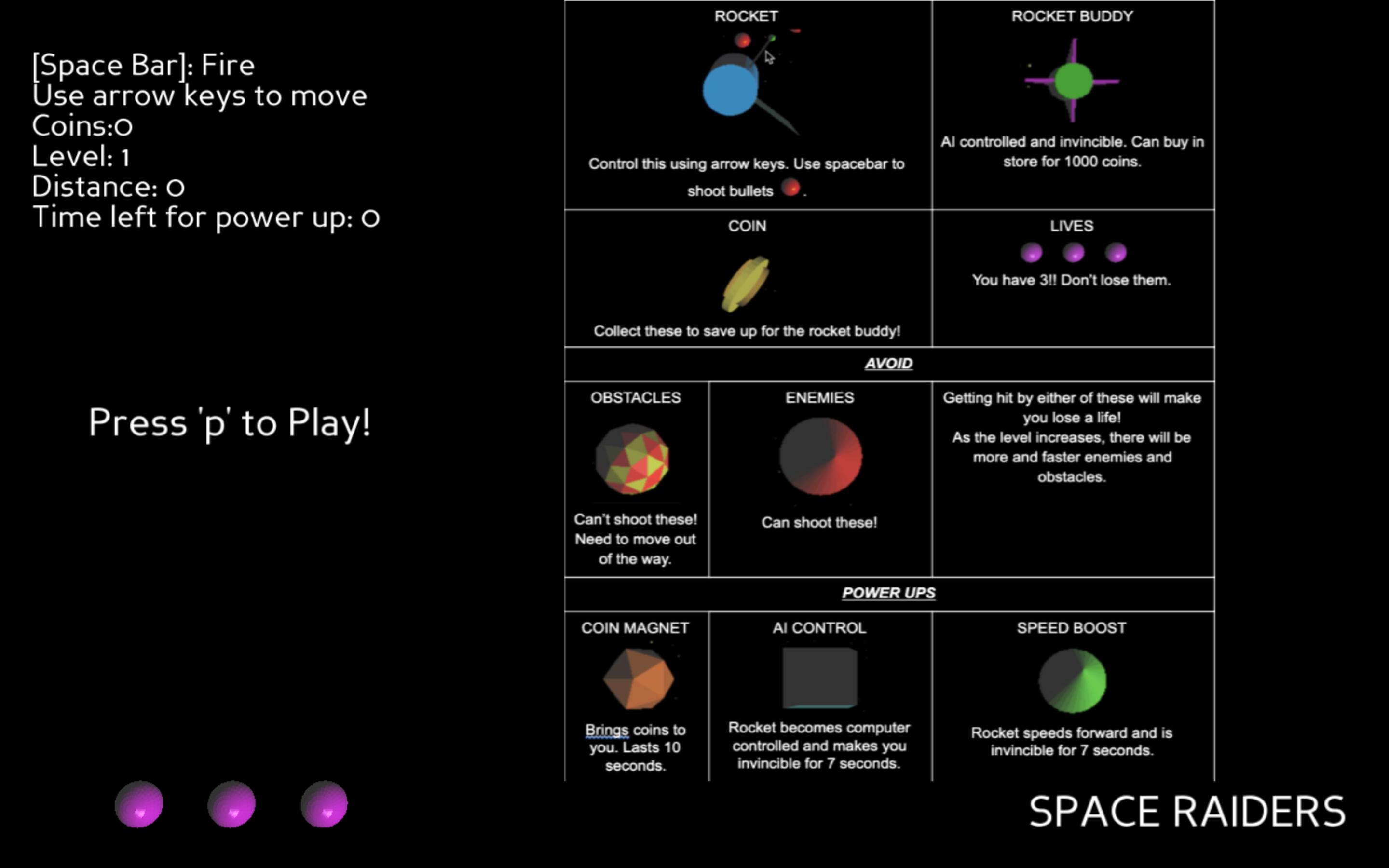 - A 3-dimensional video game that has a rocket (controlled by arrow keys) that can shoot at obstacles and collect power-ups. - Implements artificial intelligence, 3D graphics, collision detection, randomly generated maps, reading files, increasing level difficulty, and memory storage and access |